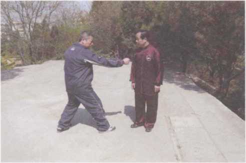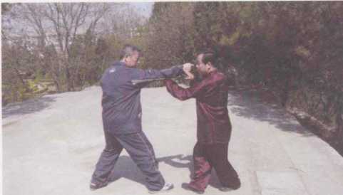即上左步,左 掌贴右肘向前 穿击对方面部, 同时以右掌击 其胸部(图9-3、 4 b左右式动作 相同,唯方向 相反。