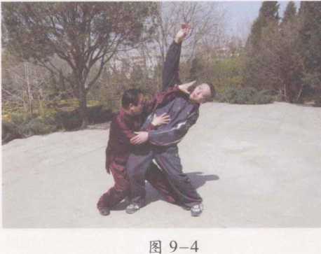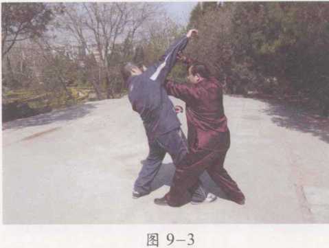 动作说明: 设对方用右拳 击我,我上右 步左掌前穿, 向左转胯左掌 向左反扣,右 掌反截对方右拳 (图 9-1、2),随
