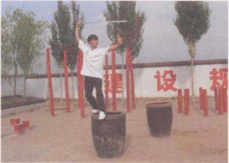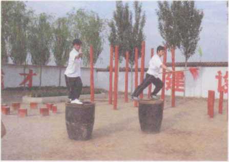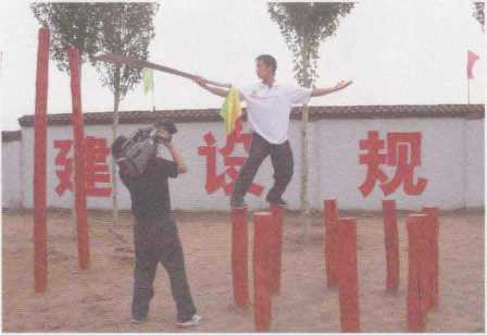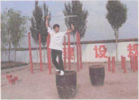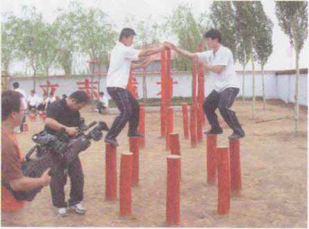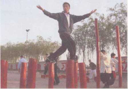 选手朱庆垒、毛恩青桩上八卦掌对练