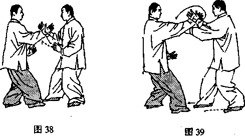 动作3:甲左掌臂外旋,贴乙右臂向前上方穿的同时,右掌 臂内旋,随上右步跟上左步,竖掌塌腕,拍击乙胸部;二目前 视。(图40)