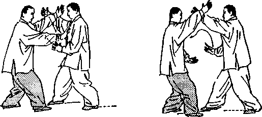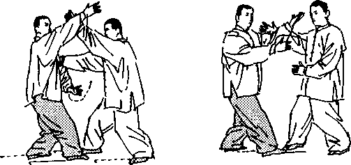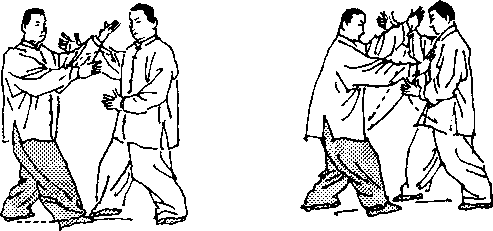 动作4:乙撤步空胸,引空甲进攻之掌;同时,左掌臂外 旋,贴甲右臂内侧向前上方穿,并带动甲手腕,经左、下、右、 上,缠绕一圈;左掌下降与肩平;甲左掌屈臂内旋,回撤至护气