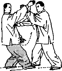 动作6:甲退左步跟退右步,空胸引开乙拍击之掌;同时, 左掌臂外旋,在乙右臂下向前上方穿,并带动乙手腕,经左、 下、右、上,缠绕一圈,右掌向回撤;二目前视。(图43)