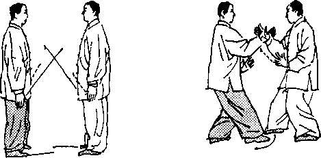 动作1:接上式;甲乙二人同上右步;同时,右掌前伸,手 腕外侧相搭;左掌屈臂护气口;二目对视。(图38)