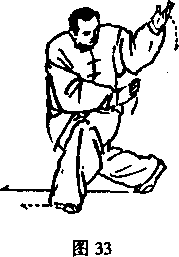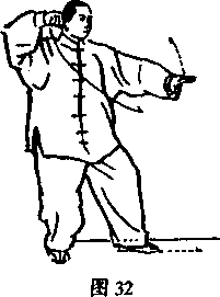 向前上左步,跟上右步;右掌屈臂内旋向右后上方捋带;左 掌直臂内旋,掌心向下,向前下方招;二目前视。(图32)要点:向前扫和向后捋带,要一齐动作,劲要整。