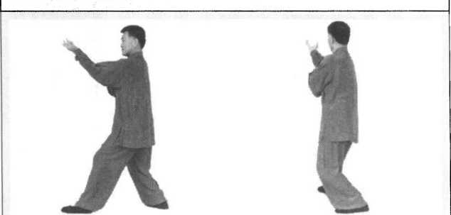 向方位②上右步,同时右掌掌心向上,自左臂下向方位② 穿出,二目前视。又名“移花接木工