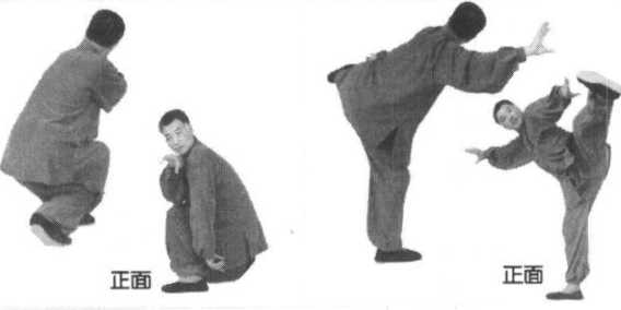 转身蹬腿:以右足根为轴,向右拧身坐步成歇步,右掌变 勾,勾至左肩前,左臂自然下垂,目视前方。