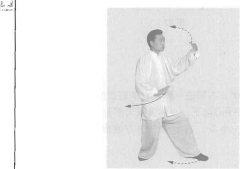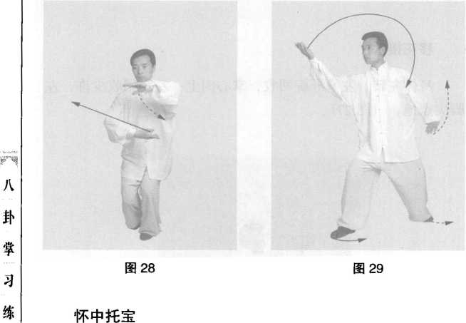 身体左转90。,右脚进一步,右掌划弧至左前臂下方, 右手心向上,左手心向下,身体重量大部分在左腿。接着 右脚向右方进一小步,右手向右前方撩出;看右前方。 (图 28、图 29)