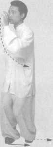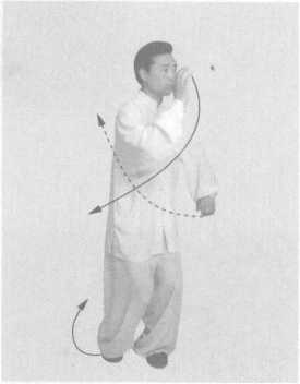 巧 身体左转90。,右手经头顶向胸前划弧,手心向前下方;