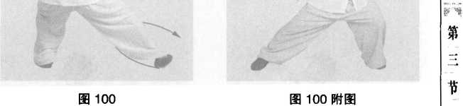 左脚后退一步,左转身,左手握拳经小腹前拉举到左耳 侧,右手按至小腹前。(图100、图100附图)