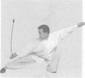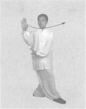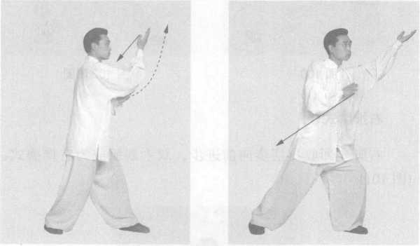 右脚先回收再摆步向前进步,双手划弧成为右推磨式。