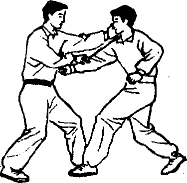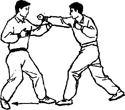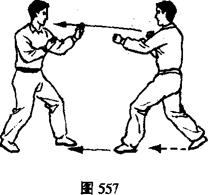 乙右脚前滑半步,向左扭腰的同时左手收回,右手以崩 拳击甲左胁。(图555)甲微左转腰右手向下拍按乙右手,同时左脚前滑半步, 右脚微跟步后向右猛回腰,左手借进步扭腰之力由面前向前图556图556图556图556下弧形劈下,力点在掌根外侧,重心下沉,双腿微屈,猛劈 乙左锁骨或头顶,可将乙击伤。(图556)(2)技法2甲乙互站左格斗势。(图557)乙左脚进步右脚跟步向左扭腰以右直拳击甲面部。(图 558)图558图558图558图558■蜀尊篝 263