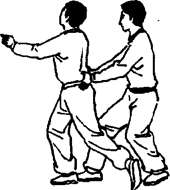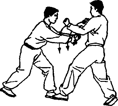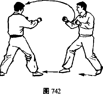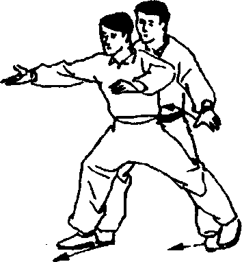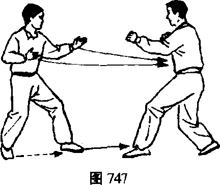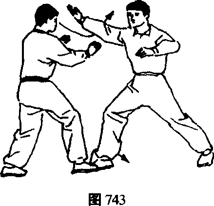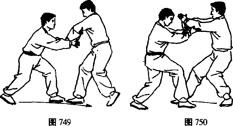 乙左脚退步,双手向前下推成掌指相对、掌心向前下, 推挡住甲双掌° (图749)
