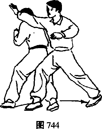上动不停,甲左脚拖至乙身后的同时,身体左转成正对 乙背,双手分向两侧再经腰侧向前成手指向下,手心向前。 (图 745)