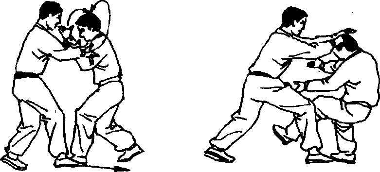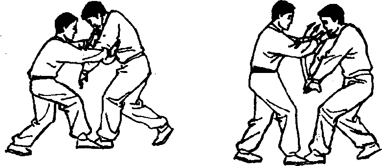 上动不停,甲右脚复进步左脚跟步再蹲身前冲,以双掌 拍按乙左腿根部,可将乙击倒地。(图757)