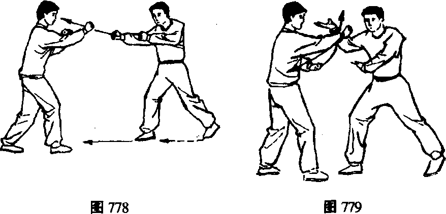 甲右脚向前迈步落于乙右脚内侧后,右手收回竖小臂护 住头右侧,左手上抬竖小臂挡住乙右臂,上身前弓。(图 785)