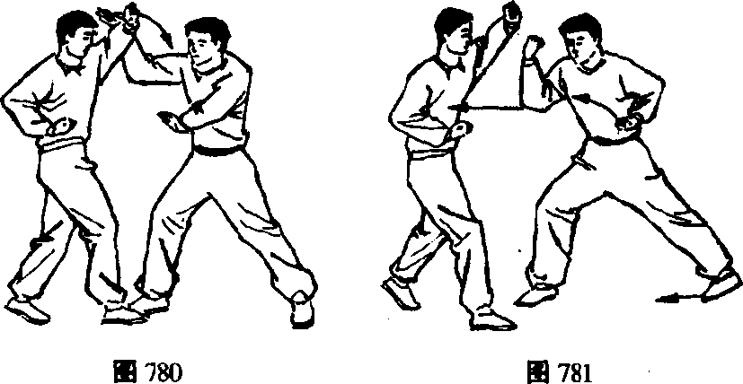 上动不停,甲向左回腰的同时上身上挺,右手掌虎口对 右肩,向肩头拉压,借挺身回腰之力带动右肘向前上挑击, 力达肘前沿,击乙下颌,可将乙击倒。(图786)