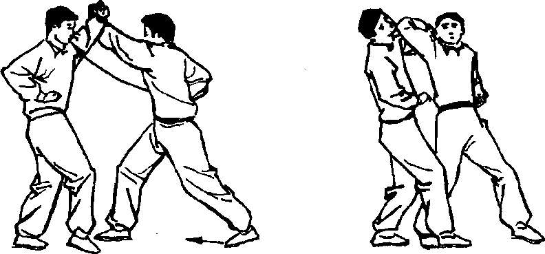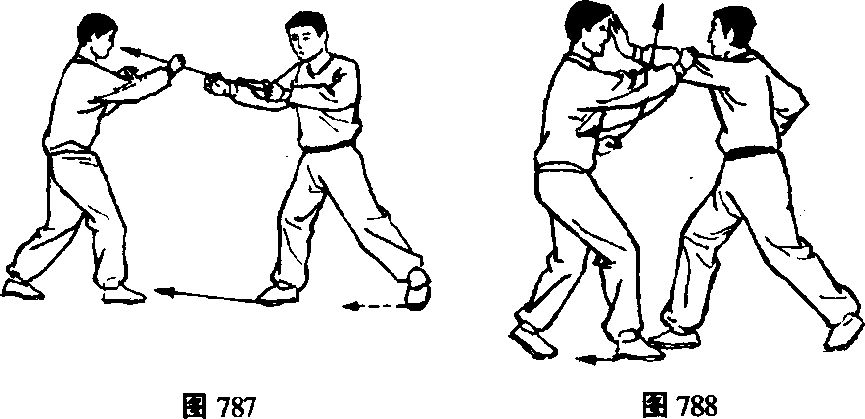 乙前脚后移身体后坐,向右扭腰的同时收右手抬左手上 架甲左臂。(图789)图789 图790甲右脚向前进步落于乙右脚内侧,重心前移后脚跟步的 同时,左手向前下推出封住乙右拳并向左回腰,右手虎口向 右肩头拉压身体上挺,借移重心扭腰挺身之力带动右肘向 前、向上挑击,力达肘前沿,击乙下颌,可将乙击倒。(图 790)〔要点〕挑肘的关键是扭腰和挺身,挑左肘先左扭腰,336 ?■■■爵 今 辱鸯朦 A D ■■■?,挑右肘先右扭腰,回腰的同时挺身挑肘。