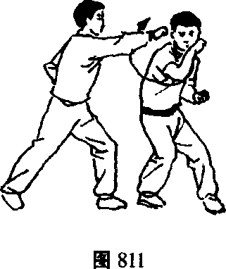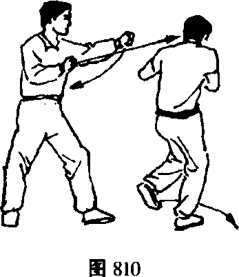 乙左脚进步右脚跟步以右直拳击甲头部。(图809)
