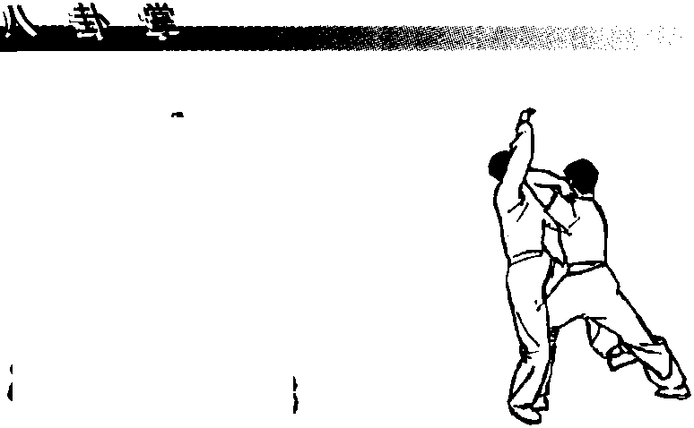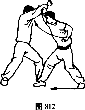 甲继续右转体,右脚摆步落于乙左脚前,重心前移成弓 步的同时,向右扭腰转身,左手由头左侧向左下猛探,右手 屈肘横小臂向上猛架乙右臂。(图812)