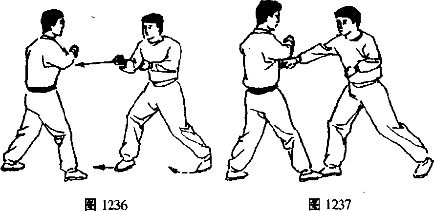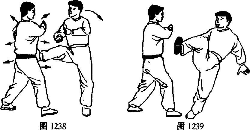 以任何势迎敌,内力聚于全身含而不发。(图1236)L敌以拳或脚击我身体。(图1237、1238)我丹田激荡,内力外吐,敌触处则如电击° (图1239)〔要点〕潜心修炼,功高不傲,力合而整,成混元之力 而终得混元一气。3.混元抖的技击要义混元抖是靠内力击敌的功夫。有一定的内功后,遇敌时,首先是全身松劲,内力聚积,以内动推外动。由根节微 动至梢节之快速抖动。此功之发,如毫无武功的精神病人发 作时,四五个力壮之人难以制住,力量超乎想象。