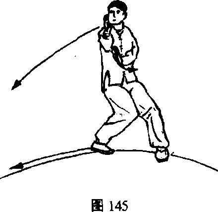 接上势,左脚向前扣步于圆圈上成脚尖对圆心,重心移 向左脚,目视右掌。(图145)
