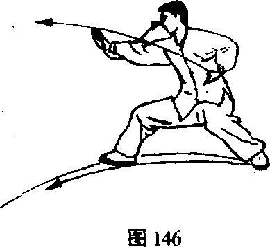 上动不停,右脚向右摆步仍落于圆弧上成脚尖向圆外, 左脚不动,重心在左脚,双腿仍成半蹲状,上动的同时左手 外旋成掌心向上收落于腰间,目视右掌。(图146)