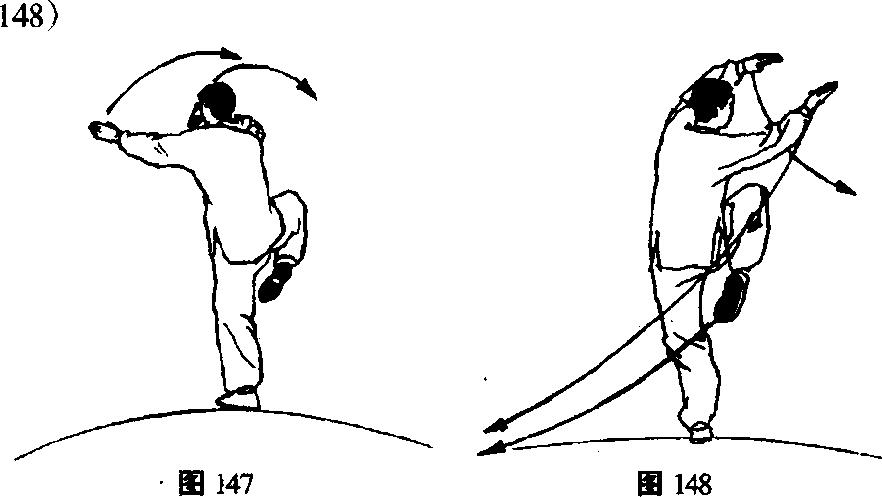接上势,左脚向右前上步落于圆圈上,左掌顺圆孤成掌 背向圆心,掌指顺圆弧穿出高与肩齐,右掌成掌心向内,掌 指顺圆弧护于左胸前,上动的同时右腿屈膝提起,膝向上顶 于右胸前成背对圆心之独立势,上身微左倾,目视左掌。 (图 147)