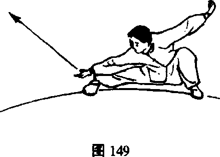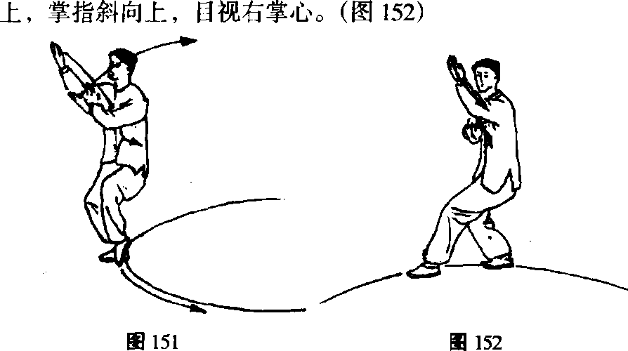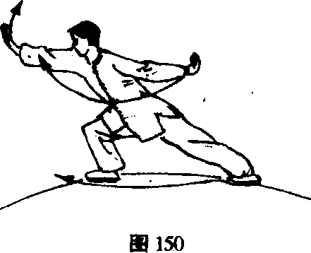 接上势,重心右移上身挺直,右脚尖摆成顺圆弧,左腿 蹬直成右弓步的同时,右手顺势向上、向前挑掌后推出,成 掌指向上、掌心向前,左手不变与右手成一水平线,目视右 掌。(图 150)0