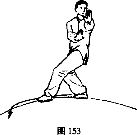 手,立于左肘内下侧成掌心正对圆心方向,食指尖距左肘尖 约一寸,双腿屈膝半蹲成八卦步。娘圆弧行走一圈至原位成 左脚在前右脚在后。眼由左掌上看出。(图153)
