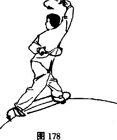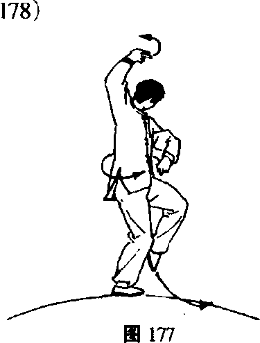 重心移向右脚,向右微晃腰的同时,左脚提起,左手松 肘松腕向左胸甩回,成掌心向上后向左腰肋反插,右手向前 上弧形点出,目视左手。(图177)
