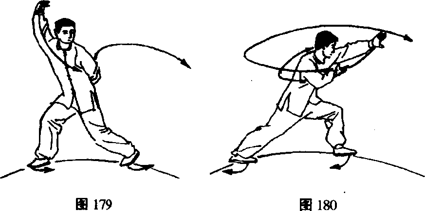 〔要点〕双脚一摆一扣,原地磨转,左手插缠于腰后, 右手弧形摆点带动转体。