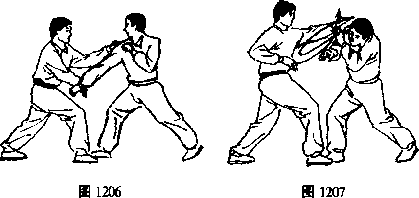 甲向左扭腰的同时右手向左、向下搬压下乙右臂,左手 成仰掌经右臂上向前穿出戳乙面部。(图1206)