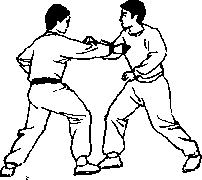 乙向左偏头的同时左手向右推开甲右掌。(图1207) 甲左手速收,右臂横臂上抬架开乙左手的同时,左手复