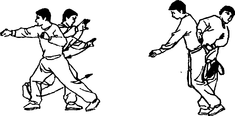 〔要点〕左右躲闪时要离敌不远不近,使敌既非发招不 可,又不能挨着我身。沉身挺身起伏要快"击敌时合身撞 击。