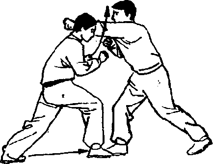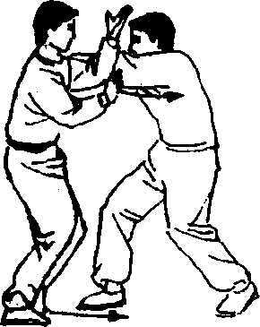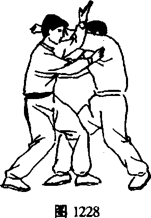 紧接着甲左脚插于乙两脚间,右脚跟步重心下沉的同 时,左臂力撑,右掌借沉重心前撑之力向乙左胸腹猛撞,可 至乙重伤。(图1228)