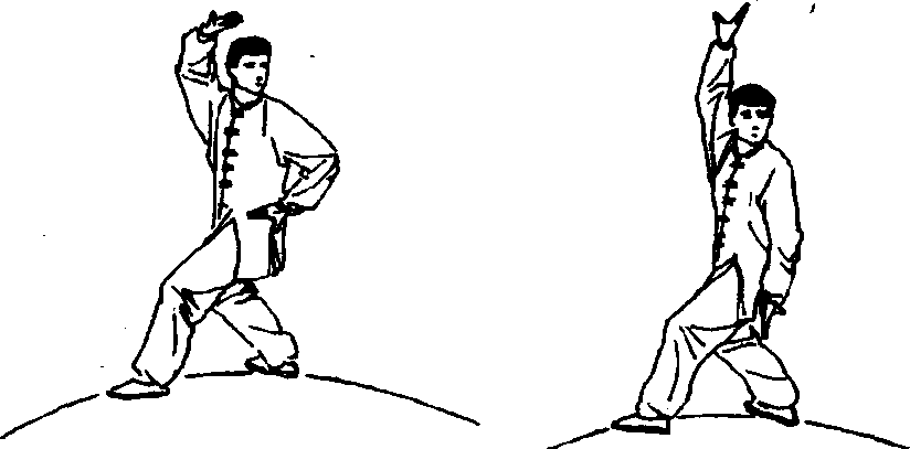 动作说明:身形步形同前各势。右臂贴耳向上直伸,手 臂内旋使掌心向体内右侧,掌指向上,左手贴于左胯侧向下 直伸,手臂内旋使掌心向体左侧,掌指向下。双手虎口撑 圆,其余四指自然分开,目视圆内。