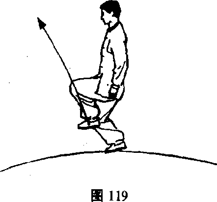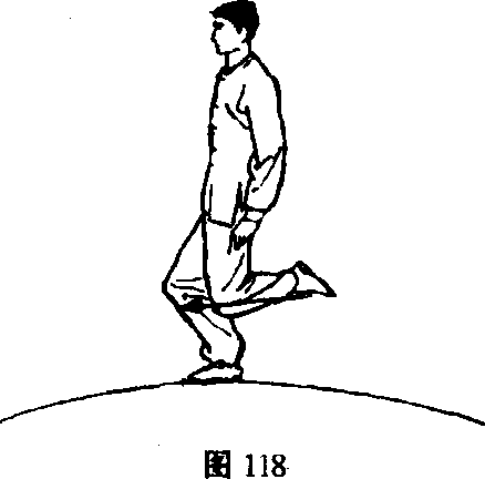 上动不停,重心完全移交右脚,左脚向后刮地翻掌提起 成脚掌向后上高至膝弯部复成(图118)势。如此往复走转 于圆圈之上。