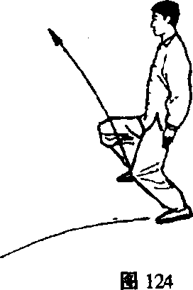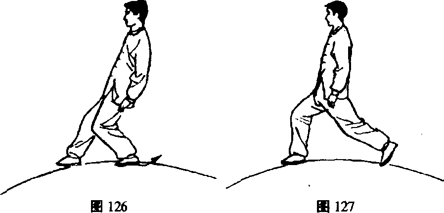 上动不停,重心前移,左腿向前向下蹬踏而下,脚背绷 平,上身微向后倾。(图121)