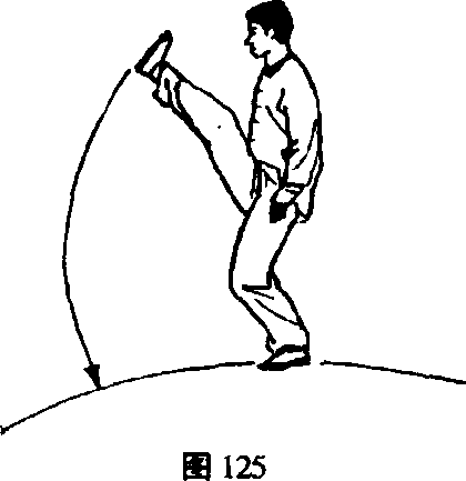 上动不停,右脚向前上翻掌蹬出,腿尽量贴胸,脚高与 嘴齐。(图125)