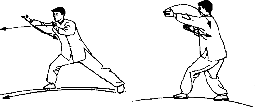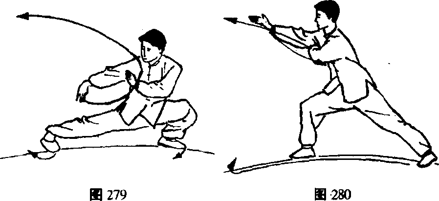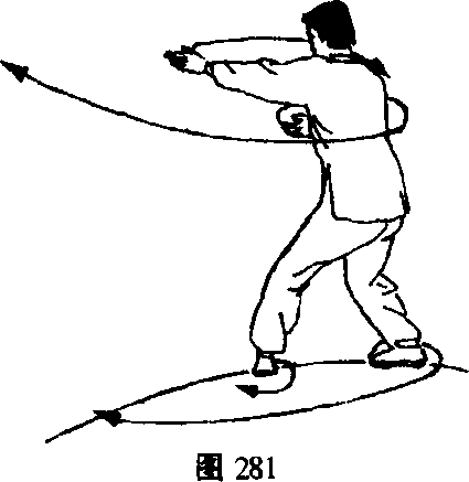 接上势,左脚向前扣步落于圆弧上,向右转体成背向圆 内的同时,右掌收回胸前仍成掌心向上,左掌成掌心向圆外 指尖向前随扣步向前戳出,目视左掌。(图281)