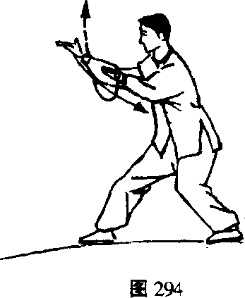 接上势,左脚向前扣步,右脚摆步身体右转成体左侧对 圆内的同时,双臂外旋成手心向上"随转腰向在上斜摆并前 送成右掌高与头齐,左掌置于右肘内侧,双肘坠,目视右 掌。(图294)