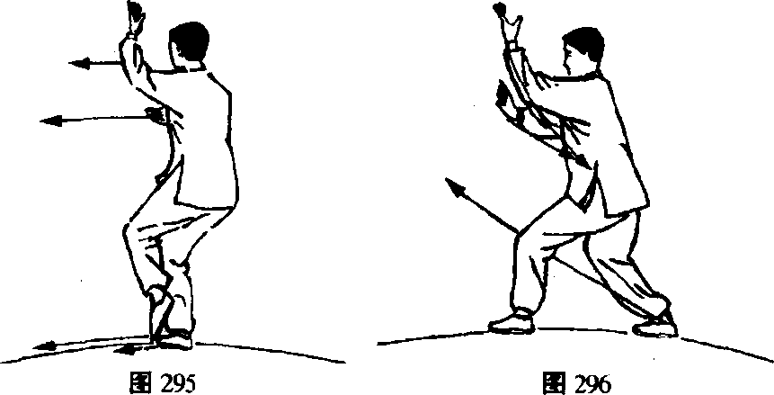 上动不停,左脚进步右脚跟步的同时重心下沉成骑龙 步,右手掌借进身沉重心之力向前撞出,左手微向上举成掌 指高过头。(图296)