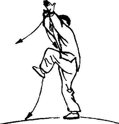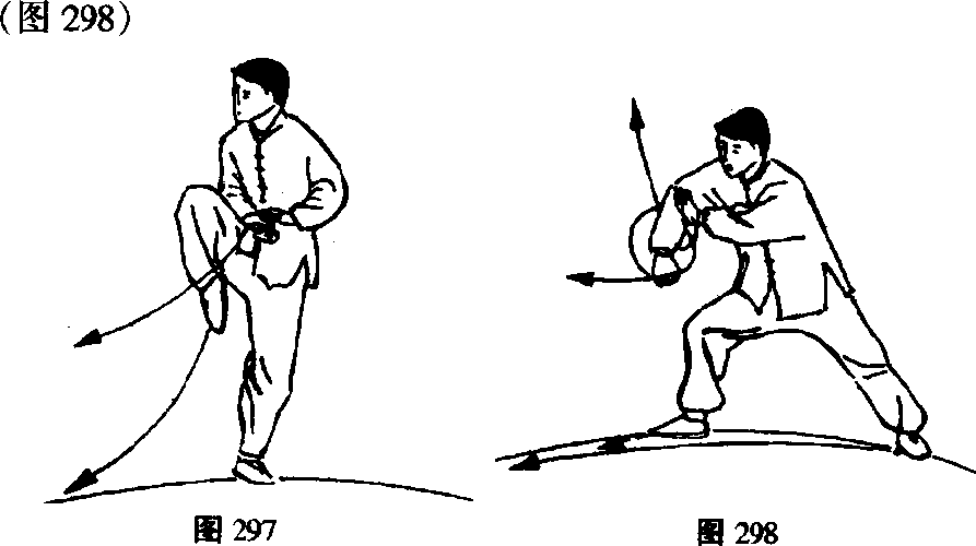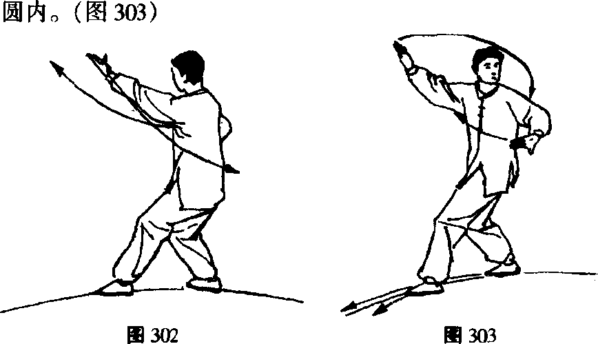 以此势沿圆走转一周成右脚在前左脚在后。