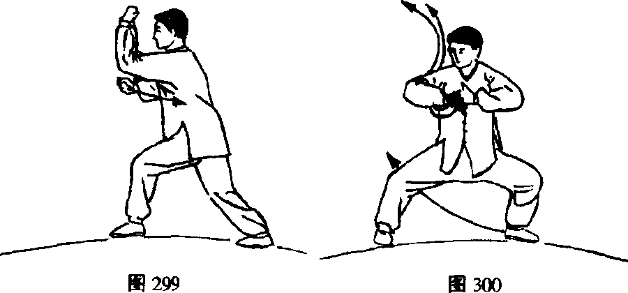 接上势,左脚顺圆弧上步右脚跟步成骑龙步的同时,左 臂外旋成手心向后,握拳向上冲起拳高齐头顶,右臂外旋握 拳成拳眼向上,借向左扭腰之力由左肘底向前击出,目视前 方。(图299)