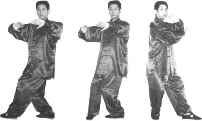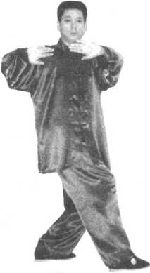 图 6.24图 6.24①接上势,一边向左走匿一边左臂外旋,掌指 向下,掌心向外,沉肩屈肘,向圆心推出,右掌掌 心向下停于左肘之下。向左走转十匿,自然呼吸, 气沉丹田,二目向圆心平视,练习左掌的掖撞之力(图6.24)。