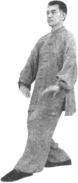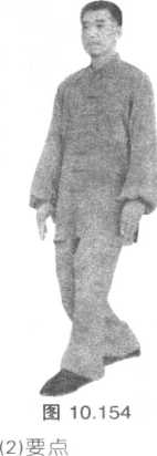 ①接“点腿”。在起势处,向左走圈,重心移于右腿,上左足,双臂 自然垂于身体两侧,五指指尖朝下,自然弯屈,虎口微分,其余四指自然 贴拢,尽力松肩向下伸臂,五指尽力下插,仿佛要插入地下,二日向前平 视(图 10.154)。