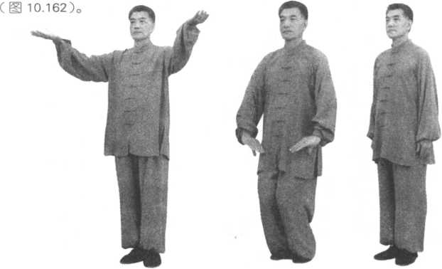 ①接“按掌”。在起势处扣步回身,上右足,双足并立,双掌掌心向上, 自身体两侧徐徐托起,高与肩齐,吸气收腹,二目向前平视(图10.160)。