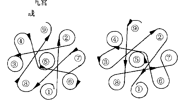 5 .要点 一切要点与行步相同。练习九宫的目的是为步子 灵活,行走自如,为“以走为用”打基础,并为练“八卦九宫掌” 打好基础。