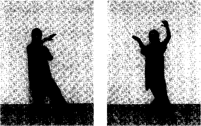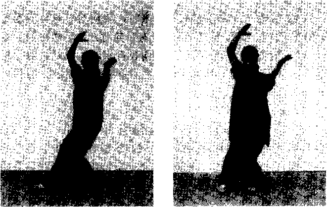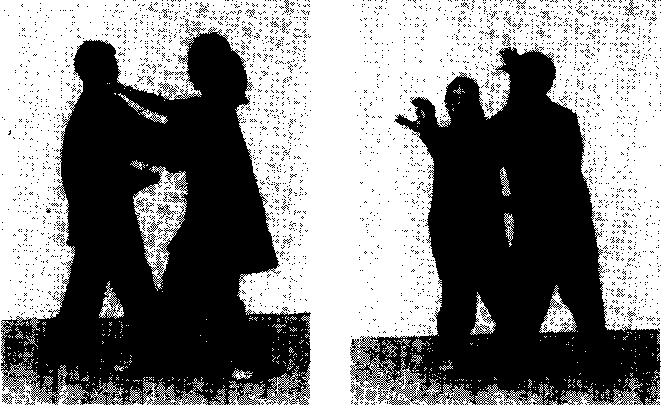 (2)对方化解我的横切,又向我打来时,我则向对方身体 右侧上左步再上右步,用狮子张口之右掌迎之,向对方身后绕走, 目视对方(图71) .