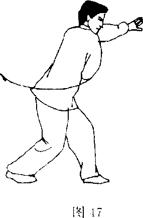 与肩齐.左掌旋腕转臂随右掖掌,置于体后方,掌心向上.略低 于肩;目视右掌(图49)。